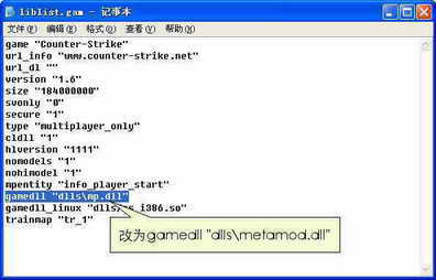 ①下载metamod.dll(下载地址:http://metamod.org/dl/dlls/metamod.dll.zip)后解压到hlserver\cstrike\addons\metamod\dll下,然后用记事本打开hlserver\cstrike\liblist.gam,将其中的gamedll "dlls\mp.dll"改为gamedll "addons\metamod\dll\metamod.dll"即可。