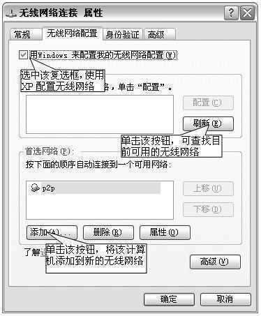无接入点的对等无线网络需要配置好每台计算机的无线网络,由于Windows XP提供了对无线网络的支持,可直接在“网络连接”窗口中进行设置,无须安装无线网络客户端。如果是Windows 98/Me/2000操作系统,则必须安装无线网卡所提供的客户端软件,并借助它配置无线网络。