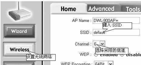 ③选择“Home”标签,点击“Wireless”按钮,进入无线配置页面(图9)。在“SSID”框中输入家庭无线网络名称。在“Channel”下拉列表中选择该无线路由使用的信道,当只有一个无线AP或无线路由时,可以选择任意信道。