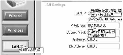 ④点击“LAN”按钮,设置IP地址信息(图10)。选中“Static IP Address”选项,为该无线AP指定静态IP地址。分别在“IP Address”和“Subnet Mask”框中键入该无线路由的局域网IP地址和子网掩码,用于实现与局域网的连接。如果小区没有采用“192.168.0.0”私有IP地址段,可以采用系统默认值。如果与小区使用的IP地址段发生冲突,可以使用“172.160.0.0 ~172.16.31.254”或“10.0.0.0~10.255.255.254”中的任意一段IP地址。若网络内安装有DHCP服务器,则可以选择“Dynamic IP Address”选项,让该无线AP自动获取IP地址。