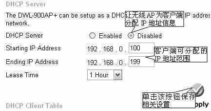 ⑤点击“DHCP”按钮,设置动态IP地址分配(图11)。选择“Enable”选项,启用DHCP服务,无线网络中的客户端只须采用系统默认的“自动获取IP地址”和“自动获取DNS服务器的地址”选项即可,无须再为每个客户端设置IP地址信息。然后,分别在“Starting IP Address”和“Ending IP Address”框中输入欲分配的IP地址的范围。