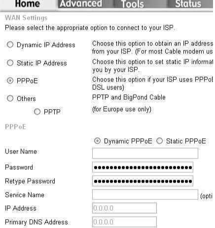 如果采用ADSL接入Internet,则应当选择“PPPoE”选项,然后分别在“Username”和“Password”框中键入在ISP申请的用户名和密码。
