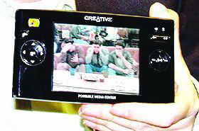 想到电影院去看电影吗?什么,影院的人太多,票不好买?现在不用着急了,创新推出的这个随身多媒体播放器能够满足你随时随地看电影的愿望。该产品的正式名称是“随身媒体中心”(Portable Media Centre,PMC),采用日立1.8英寸微型硬盘,有40GB储存空间,可存1万首歌曲,并有USB 2.0接口。软件方面采用微软开发的Windows Mobile操作系统。当然它最主要的卖点还是在于能够储存175小时的影片。比尔·盖茨在CES展前发表演讲时,就展示了创新这款随身媒体中心。