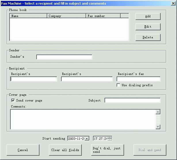 文件扫描完成后,便可以点击“Send fax(发送传真)”进入传真发送对话框(图3)。输入对方的姓名、公司和传真号码并勾选“Use dialing prefix(在拨打对方传真号码前,先拨单位规定的要拨外线时先拨打的号码)”,如果需要发送传真封面还可以在“Cover page”中设定封面的主题和内容。
