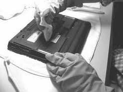 外表越绚丽的本本长时间使用后外壳越容易被磨损,一些采用铝合金属外壳设计的本本相对更容易维护一些,通常只要一块棉布便可以使外壳一尘不染。但是考虑到轻便性及生产成本等问题,一些本本的外壳镀层往往非常“脆弱”,一不小心就会脱落一块,而像IBM本本这样一身黑的外壳,反而经久耐用。现在市面上能买到笔记本电脑专用的塑料透明保护膜,薄薄的、透明的,把它贴在本本的顶盖上,既不失美观,也能很好地保护顶盖不被划伤!如果买不到这种薄膜,也可以在本本表面打上地板腊,既美观又实用(图2)。