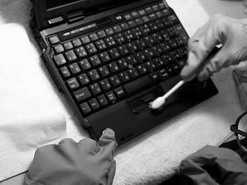本本鼠标的保养相对键盘来说就比较好办多了,至于本本的指点杆,如果磨损了换一个“帽子”就OK了,如暂时找不到替代品的话,你也可以先把“帽子”取下来,用粘有少量牙膏的牙刷轻轻擦拭(图4),凉干后就可以继续使用了。注意千万不要用酒精浸泡,否则“帽子”上的绒毛会全部脱落的。而对于使用触摸板的用户,长时间使用后会使它的四周积聚很多脏物,用湿润的棉签仔细清理干净即可,但是千万不要把水洒在上面。