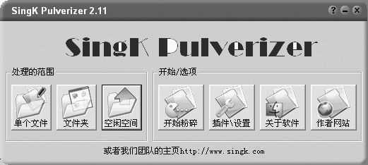 该软件是SINK PULVERIZER V2.11中文版,下载地址是:http://www.onlinedown.net/soft/8960.htm,才1605KB,安装也很方便。其主界面如图1所示。其操作步骤更简单,只要选择粉碎范围再执行粉碎即可。它支持的鼠标右键功能更是简单。请看其图,左边是关于处理范围的三个按钮。右边是“开始/选项”的四个按钮。先说左边,这里可以选择“单个文件”、“文件夹”和“空闲空间”。开始笔者感觉这个功能似乎少一个关于整个驱动器的选项,后来使用时才发现,这个功能对数码相机并不实用,对粉碎硬盘数据更有用些。如果你只要粉碎一两个重要文件,使用“单个文件”按钮即可,如果要粉碎一个文件夹的全部文件,选择这个“文件夹”即可。注意,粉碎文件夹后,文件夹还存在,只是其中的文件被彻底删除了。