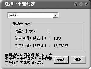 在使用过程中,要注意两点,一是在使用范围选择时,一定要在图1中“处理的范围”后看到被选择的具体的文件或文件夹再执行“开始粉碎”功能,这样等于在粉碎前再次经过了确认。建议大家直接使用插件,用鼠标右键操作更安全;二是在使用“空闲空间”按钮时,注意别选择错了驱动器,因为很多电脑同时使用多个数码设备,比如同时使用数码相机和闪存,选择时别搞乱了。图2所示的就是16MB的数码相机存储器,仔细辨别清楚,就不会误粉碎了硬盘驱动器。