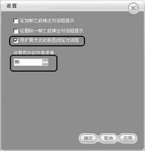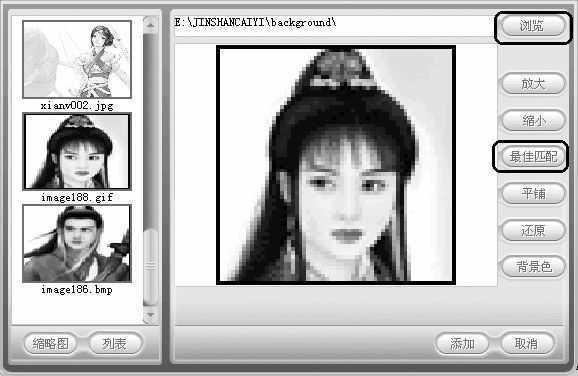 下面我们就来实际操作一下:首先在编辑区下方点击第一帧,然后在资源区选择一幅图片作为背景图案,双击图片或点击“添加”按钮即可。如果对软件中预置的图片不满意,可以点击“游览”按钮打开图片编辑窗口找到图片所在文件夹(提示:如果弹出的仅是一般添加对话框,请打开“文件/设置”,选中“以扩展方式的底图浏览对话框”选项即可,如图2),双击缩略图中的图片,再用放大或缩小按钮来调整尺寸,建议选择“最佳匹配”,最后设置好背景颜色点击“添加”即可,支持的图片格式有JPG、BMP、GIF(图3)。