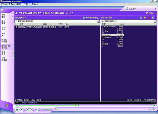 插好你的MP3 DISK,打开WMP,再打开你要拷贝的音乐文件(只要是WMP支持的格式都行,包括MIDI文件),选取“复制到CD或设备”选项,看,左边是你要复制的音乐文件,右边已辨认出你的MP3 DISK,并在下方列出盘上已存的MP3文件(如图)。在左边的列表中将要复制的文件前打勾选取,默认为全选,点取右上角的复制按钮,搞定!WMP会自动将各种格式的音乐文件转换为MP3 DISK支持的格式并拷贝过去,一杯咖啡的功夫,你最爱的随身专辑就做好了!