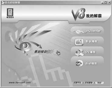 选择“m2Center”可登录豪杰多媒体中心,这里提供了在线影视、手机图片、铃声、娱乐花絮等多媒体服务;通过“影音播放”按钮你可以对本地影音文件进行播放;“DV播放”是《豪杰超级解霸V8》新增加的功能,可显示DV、DC(需要带影像功能的DC)、摄像头中的即时图像,甚至还能接收电视卡中的电视节目;选择“自动播放”按钮可使超级解霸自动搜索光驱中的影碟进行播放,即使是超级菜鸟也会用解霸啦。