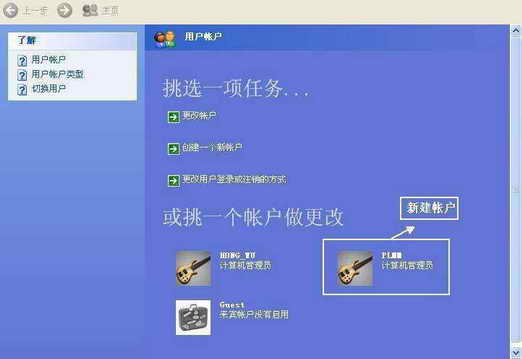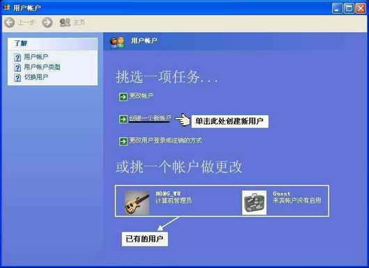 提示:在Windows XP系统中,系统提供了“计算机管理员”和“受限”两种类型的权限用户。“计算机管理员”拥有对计算机操作的全部权利,可以创建、更改、删除账户,安装、卸载程序,访问计算机的全部文件资料;而“受限”类型用户账户只能修改自己的用户名、密码等,也只能浏览自己创建的文件和共享的文件。我们可以根据需要进行创建。