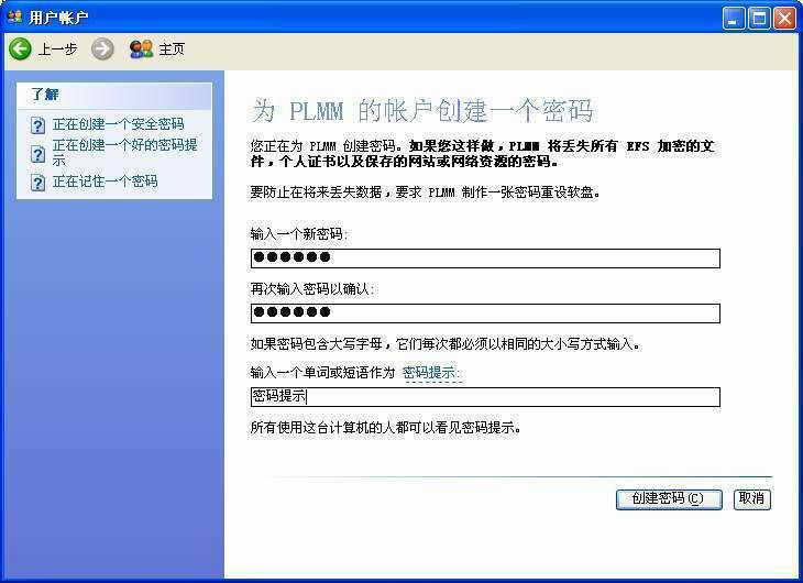 1.单击“用户账户”列表中新建的用户,进入“你想更改用户什么?”窗口。单击其中的“创建密码”弹出一个“密码设置”窗口(图3),在“输入新密码”和“再次输入密码”项中输入一个该账户密码,在下面的密码提示中输入密码提示语言。随后单击“创建密码”按钮即可为该账户添加密码。