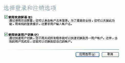 在“用户账户”界面中单击“更改用户登录和注销方式”,进入到“更改用户登录和注销方式”窗口,在窗口中提供了“使用欢迎屏幕”和“使用快速用户切换”两种登录方式,在此我们必须进行设置(图5)。设置后单击“应用首选项”按钮即可。