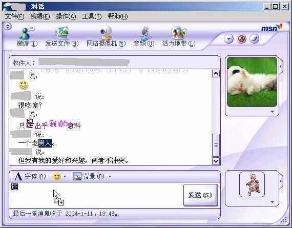 MSN Messenger作为一款非常好用的即时消息软件,深受广大计算机爱好者的喜爱,目前在国内已经拥有了大量的用户群。而微软拼音输入法也是正在被广泛使用的输入法之一。在用MSN Messenger聊天的过程中,在“对话”窗口底部的小框中用微软拼音输入法键入文字时,只要不按回车键确认,让输入的文字处于选择状态,然后用鼠标拖动复制“对话”窗口中的任意文字到窗口底部的小框中(如图所示)。这时,MSN Messenger会停止响应,紧接着,对话窗口消失,MSN Messenger也被强行关闭,你只有重新登录了。