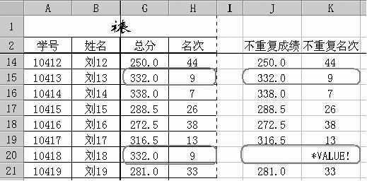 提示:经过这样的设置后,在J列将不重复的成绩提取出来(重复成绩只提取第一次出现的成绩)。