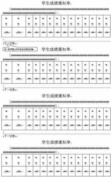 在创建主文档时,将页面设置为A4纸,然后创建成绩通知单文档,将成绩通知单设计成小条样式。选取数据源,在每一张通知单内相应位置插入合并域,最后在上一位学生成绩通知单的最后一个域和下一位学生成绩通知单的第一个域之间插入Word域下拉列表中的“下一记录”(见图) 。这样在A4纸上就能打印多条记录,免去了合并到新文档后用替换分节符号的方法带来成绩通知单有时出现跨页的烦恼。用这种方法还可以打印工资条、制作学生证等。 (刘伟)