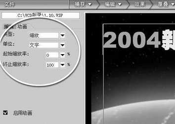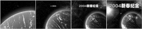 本次实例的片头动画情节是这样设计的。气势宏伟的星球随着雄浑的音乐,从我们的视野中慢慢地旋转出来,慢慢远去的光线变暗。突然一个很小的亮点从遥远的地方慢慢地向我们飞来,随着星球的远去,这个亮点越来越大。当我们看清这个亮点是什么的时候(视频动画的主题“2004新春纪念”),从画面的左侧出现一道亮光,越来越亮……直到视频动画的主题完全占据画面的位置,最后定格(图1)。