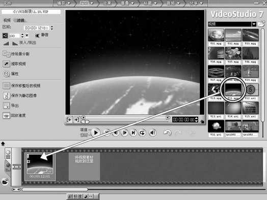 1.添加动画效果。在《会声会影》中点“编辑”模块。在预览窗口右边的素材区,有许多现成的动画效果素材。我们选择V11.mpeg,将它拖到下面编辑区的视频轨道的第一个方框中(图2)。接下来我们要对这个片头动画加上文字动画效果和声音。