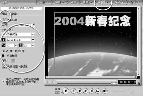 2.文字动画设计。点“标题”模块,在这里我们输入片头文字。比如我们输入“2004新春纪念”。在视频的左边的编辑区,对字体的大小、颜色以及效果进行设置(图3)。字体的大小可以大一点,这样更有冲击力。