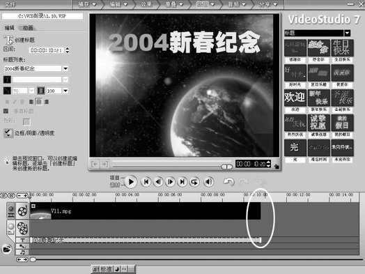 字幕的制作方法可参见前面片头的设计。这里你只要在时间轴上将时间标尺移动到需要插入字幕的位置,然后点击最上方步骤栏“标题”按钮的下拉箭头,选择“编辑”,单击预览窗口,激活文字编辑程序,在窗口的合适位置输入字幕内容(图10)。注意,插入的文字位置和占据的时间长短要适宜。