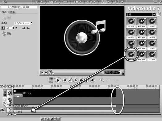 5.给片头添加音效。片头动画没有音乐,好效果是难以出来的。一般片头动画的音乐都比较有气势。音乐的素材很广泛,这里我们就利用《会声会影》中现有的音乐素材。点音乐模块,在右边的素材库中选择“A10.mp3”。然后将它拖到下面编辑区的音轨上,并将音乐的长度拉到与视频动画一样长(图6)。