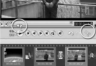 2. 剪辑视频。在视频轨上选取需要编辑的视频文件,使它成为红色边框编辑状态,然后拖动预览窗口下面的飞梭手柄,找到你要分割的帧幅(如果手拖不好控制,还可以用下面的逐帧按钮微调),确定后,点击右边那把剪刀(图8),这样就把刚才的视频素材剪成两段。