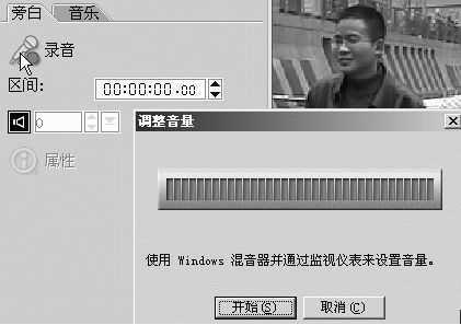 在预览窗口上面的“音频”按钮上点右键,在下拉菜单中选“旁白”,此时左上方出现了录音设置窗口。点击话筒图标,弹出音量仪表对话框(图11),点击“开始”,就可以录制你要解说的旁白了。