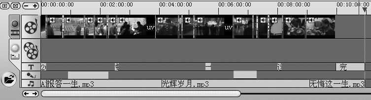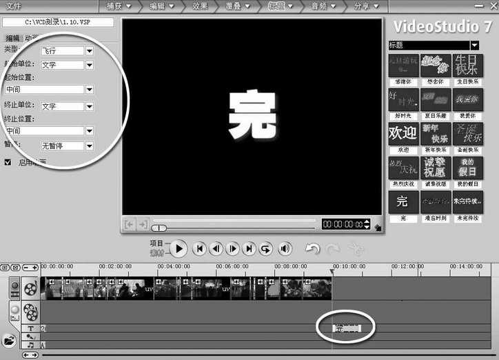 一部完整的作品,必须有片尾。片尾的设计你可以尽情地发挥。比如你可以把导演、编剧、主演统统署上,最后一个画面显示“完”。还可在这个“完”的动画效果中加上一个重音效果。片尾的制作方法和片头一样,这里就不详细介绍了。注意片尾放的位置是在所有的视频结束后的末尾,不要插在画面当中去了(图13)。