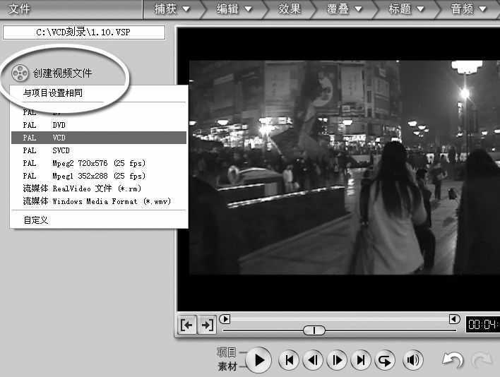 点预览窗口上最后一个设置“分享”。这里有两个选项,“创建视频文件”、“创建光盘”,第一个“创建视频文件”可以直接在电脑上生成VCD、SVCD以及DVD等文件。“创建光盘”。可以直接刻录VCD。但用《会声会影》来刻录光盘过程实在有些繁琐,不如用专业刻录软件来得简单。这里我们选择“创建视频文件”,在下拉菜单中选“PAL-VCD”(图15),弹出保存为命名文件对话框,输入文件名,点击“确定”后自动开始渲染。剩下的时间就是漫长的等待了,根据视频文件的大小,渲染的时间一般比拍摄的时间长。还有和你的电脑配置也有关系。一般一个小时的VCD光盘需要一个半小时左右。最后渲染完成的MPEG文件可以用于光盘刻录,也可以直接在电脑上用视频播放软件播放。