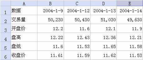 由于制作股价图对数据格式有一定的要求,导入工作表的网页数据往往不能直接使用,为此需要对已经获取的数据进行整理。假如我们需要利用行情数据绘制K线图,工作表的数据系列必须按照交易量、开盘价、盘高(最高价)、盘低(最低价)和收盘价的顺序排列,并用股票品种或日期作为数据标志(相当于数据库字段)。因此,我们需要另外建立一个“行情数据”工作表,按照如图3所示的格式将数据复制到里面。