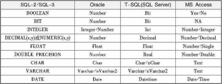 每个DBMS所包含的附加数据类型名称有可能不同,朋友们可以参照对应产品的技术说明书。上表中列出了一些常见数据类型名称在不同数据库系统之间的变化。