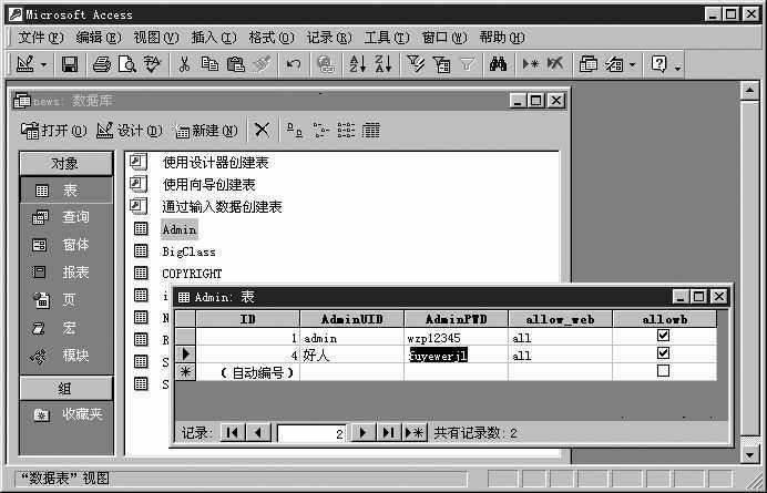 图1就是下载数据库news.mdb后,随意查看到的管理员的用户名和密码信息。可以直接看到“admin”和“好人”的密码分别为“wzp12345”和“fuyewerjl”。如果这样的管理员权限被别人利用,那么这个网站就危险了!一个精心设计的网站就可能就会被修改得面目全非。最恐怖的是这些操作不需要什么攻击知识,仅仅是会点击鼠标和操纵键盘就可以搞定。