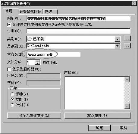 而Flashget在处理包含uncode码链接的时候却“自作聪明”地把unicode编码做了对应的处理,比如自动把“%29”这一段unicode编码形式的字符转化成了“(”,所以你向Flashget提交一个http://127.0.0.1/xweb/data/%29xadminsxx.mdb的下载链接,它却解释成了http://127.0.0.1/xweb/data/(xadminsxx.mdb。看看我们上面网址的地方和下面的重命名的地方是不同的,Flashget把“%29xadminsxx.mdb”解释为了“)xadminxx.mdb”(图2)。