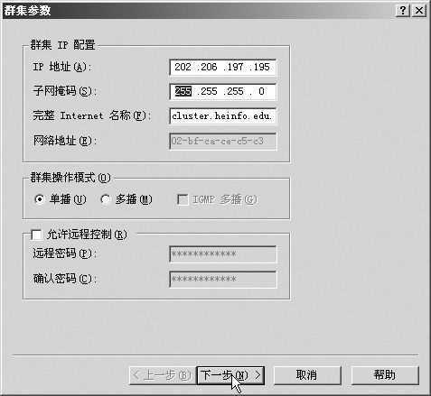 在“IP地址”后面输入规划的群集参数地址202.206.197.195,在子网掩码处使用默认值,在“完整Internet名称”后面输入cluster.heinfo.edu.cn(也可以是其他的名称,但输入的DNS名称必须与输入的IP地址相符)。