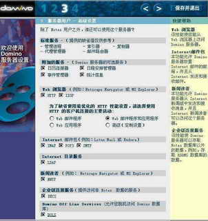 进入配置界面,它的顶部一共有四个向导,从一个向导到另外一个向导的切换,可以点屏幕右上角的方向键。其中向导一是选择第一个Domino服务器;向导二是选择高级配置;向导三是高级设置。