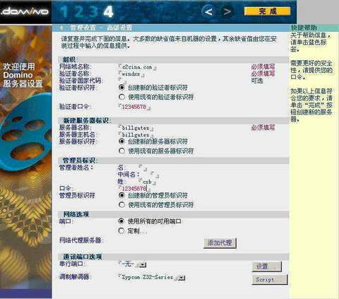 按图中的文字名称填写好了后,选择右上角的“完成”按钮,这样Domino开始第一次工作了,它先生成管理员数据库、邮件数据库等。生成后的Domino Server名称为:billgates/windxx(格式是:服务器名称/验证者名称), 第一个用户名为cxb,密码为:12345678,记录下自己的配置数据防止遗失。