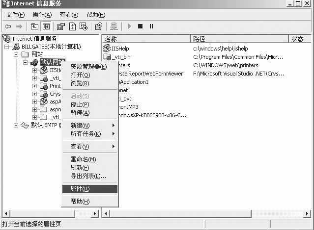 在操作之前,请先做好一个HTML文件(例如spring.htm),然后放在IIS的发布根目录下。打开IIS,如图1所示,右击“默认网站”,选择“属性”。