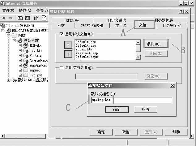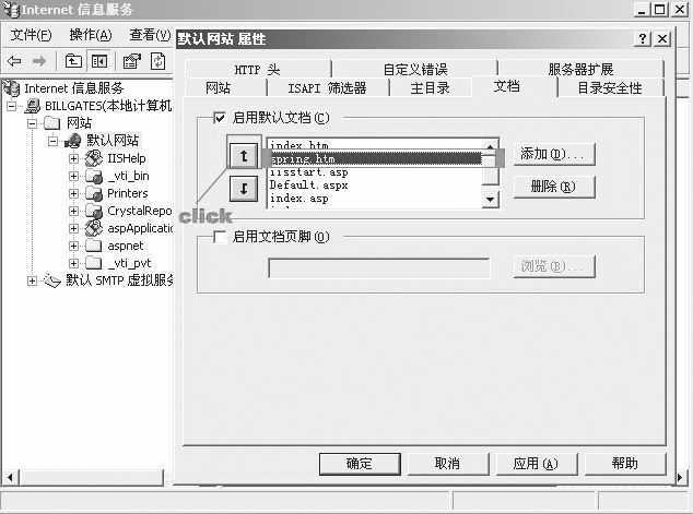 然后会打开一个属性对话框(图2),选择里面的“文档”选项卡,点击“添加”按钮,出现一个小窗体,在“默认文档名”中输入“spring.htm”并点“确定”。