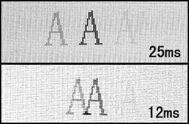 响应时间测试考虑到响应时间存在上升沿和下降沿,难以准确分别计量,我们抛弃了复杂的计算公式和CheckScreen的拖影测试,使用简单的Windows自带屏保程序(字幕显示),将显示的字符设置为字母“A”,滑动速度设为最快,以1/50秒的快门拍摄,然后对比25ms响应时间显示器在同样设置下的拍摄图片,给出直观的对比,让大家看出二者的差异。有兴趣自己在家也可以做哟:)