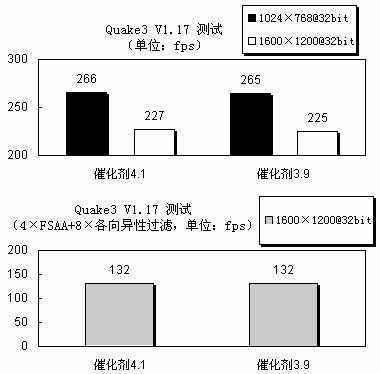 在基于OpenGL的Quake3测试里,催化剂4.1也只在常规测试中以非常微弱的优势领先于催化剂3.9,而在4×FSAA+8×各向异性过滤环境下,两款驱动的得分完全一样,没有差别。