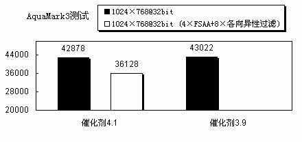 在AquaMark3测试中,我们遇到了一些困扰,安装催化剂3.9后,开启4×FSAA+8×各向异性过滤之后,进行测试会出现死机和重启的现象,不过在安装催化剂4.1后,问题得到解决,虽然不排除可能是其他软件、硬件引起冲突,但是在此项测试中催化剂4.1比催化剂3.9兼容性更好是可以肯定的。