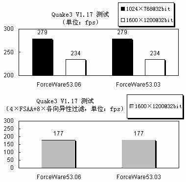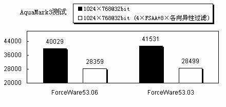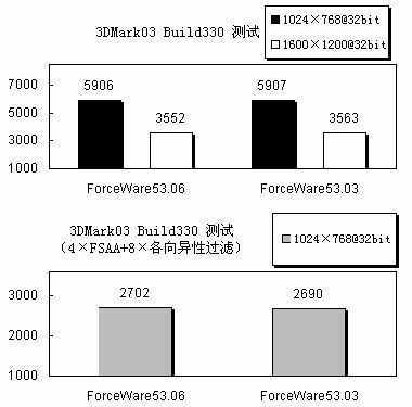 两款驱动程序的表现可以说完全是在伯仲之间,在常规测试下,53.06得分稍低,而在4×FSAA+8×各向异性过滤下,53.03又要输一点,的确是平分秋色。