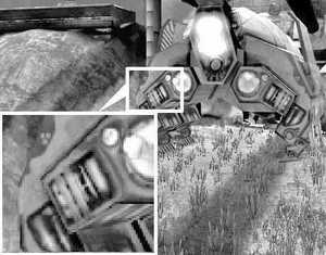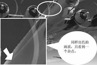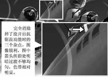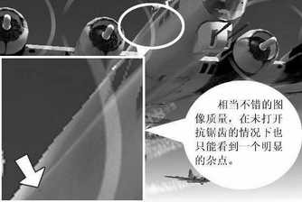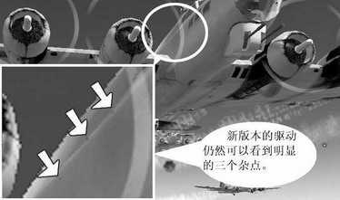 开启抗锯齿功能与各向异性过滤功能后,不管是催化剂还是ForceWare,在图像的精细程度上都有了很明显的改善,都很好地消除了只采用双线过滤时的材质杂点。而从整体来看,催化剂4.1的表现要好于ForceWare53.06,整体画面显得比较柔和细腻,而ForceWare53.06的画面色彩则表现得要锐利一些,因此在色彩的过渡上显得稍微生硬一点,从图中也可以看到,在飞机驾驶舱部分(箭头所示),催化剂的样图色彩明暗过渡自然,而ForceWare则明暗过渡得较为突兀,黑白色交界明显。