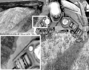 在开启4×FSAA+8×各向异性过滤后,AquaMark3的画面表现相当不错,经过各向异性过滤处理的材质显得很精细,没有出现明显的杂点和贴图错误。在消除边缘锯齿的方面,催化剂和ForceWare都表现得无可挑剔,而两者不同的地方是,催化剂4.1的色彩过渡仍然要比ForceWare53.06平滑一些,图中白框放大部分的细节证明了这一点。不过在保证色彩过渡平滑的同时,催化剂4.1也丢失了一些图像细节,比如我们可以看到在图中放大部分左上角的三颗螺丝钉,ForceWare53.06表现得很清楚,而催化剂4.1则将它们连成了一片。