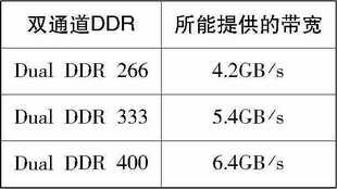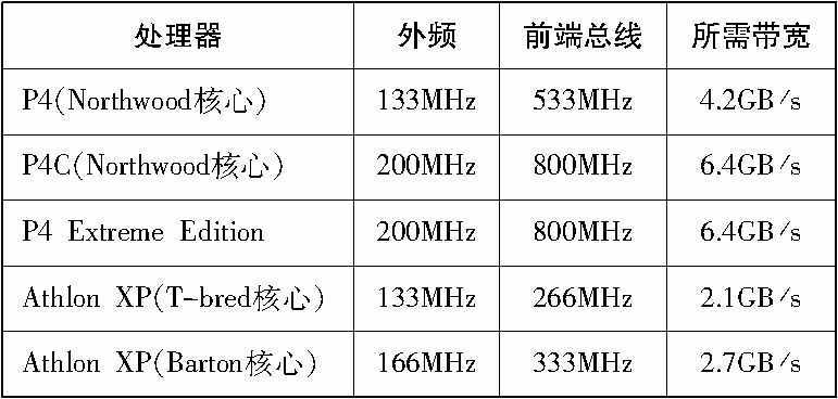 所谓的处理器所需带宽也就是处理器跟内存控制器(MCH)之间数据通道的宽窄,数据都是沿着“处理器──内存控制器──物理内存”进行传输的,因此任何一方的带宽不足必定导致另外一方数据流出现“堵车”现象,这样有一方的执行效率不能达到最佳,整体性能也随之下降。处理器所需的带宽由前端总线(FSB)所决定,计算公式为FSB 频率×64 ÷8,如800MHz前端总线的P4所需带宽则为800MHz×64÷8=6.4GB/s,533MHz前端总线P4处理器所需带宽为533MHz×64÷8=4.2GB/s,依此类推。理论上只有物理内存提供的带宽满足了处理器所需带宽,平台才不会出现数据堵塞的情况,其性能也将达到最高。
