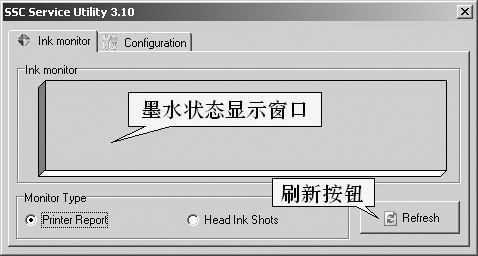 与一般软件不同的是,SSC Service Utility的主要功能都是通过系统托盘内的程序图标的右键菜单来实现的,在软件的主操作窗口中只有两个选项卡:Ink Monitor(墨水监视器)和Configuration(配置)。这和Inklevel类似,主要是显示墨水状况以及配置打印机。在Ink Monitor选项卡中,我们可以直观地看到墨水的剩余量(图3)。在此处,我们可以选择“Printer Report”模式来显示每一种颜色的墨水的剩余量;或者选择“Head ink shots”模式来查看每一种颜色的墨水的消耗量。点击“Reflesh(刷新)”按钮则可以进行实时刷新,让我们能够准确地掌握墨水的使用情况。