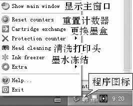 关闭主窗口,软件将最小化至系统托盘。用鼠标右键点击该图标,将会弹出命令菜单(图5)。当我们需要还原墨水的容量时,可以选择“Reset counters(还原计数器)”命令,接着确定要还原的墨盒即可。与Inklevel相比,SSC Service Utility可以重置单一色彩的计数器,也可以选择全部重置,极大地方便了用户。