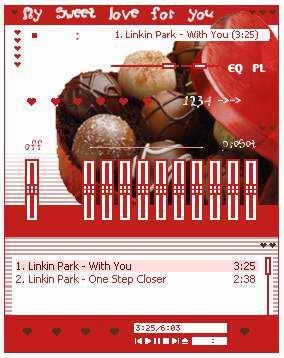 情人节似乎永远也离不开玫瑰和巧克力,这不,就连Winamp的皮肤上也有了(图4)。我们推荐的第一款叫做“Valentine's Day”皮肤,也是专为情人节所做的。大红色的基调,播放面板标题上大大的“My sweet love for you”直接而又热情。这款皮肤的控制按钮全部用红色心形来代替,红心加上巧克力显示了情人节的主题──甜蜜的爱情。