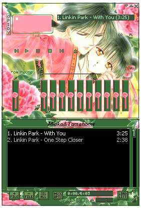 推荐的第二款是叫做“Flower”的皮肤(图5),粉红和浅绿色的搭配使整个界面看上去春意盎然,加上含情脉脉的俊男美女,让整个皮肤显得非常浪漫,透露出浓浓的爱意。Winamp的主控制面板和EQ控制面板的衔接做得非常好。EQ控制面板上做成一朵朵小花的控制滑块是这个皮肤的特色。